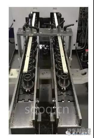下面以德国KARL Klink公司双工位上拉式液压立式高速拉床为例介绍硬拉过程。硬拉工装包含上料装置(见图13、图14)、装夹装置(夹紧及拉削过程如图15、图16所示)、下料装置(见图17)、拉刀刀柄夹具、工件预定位销(见图18)、工件定位夹具(见图19)、夹爪(见图20)、定位调整装置等,其中工件定位夹具、工件预定位销、装夹装置用夹爪针对不同品种的工件需进行重新设计及更换。
