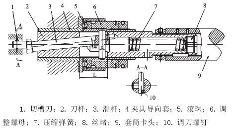 从图 2 中能够看出,该装置适用于切削较窄的环形槽,如图 1 中(a)所示,这种类型的加工方式适合加工一些如箱体类零件孔内同轴环槽等物质的加工。以钻床加工为例,解释和介绍径向切孔内环形槽装置的工作原理。通过套筒,使钻床主轴带动切孔内环形槽装置工作。其工作过程是当生产设备中的主要的装置在随着机床主轴向前时,设备中的滑杆和切槽刀和刀杆同样也在随着设备中的主轴方向做相同的轴向移动和绕轴线的旋转运动。后续的工作是切槽刀的工作程序,当切槽刀达到提前预设好的位置时,整个生产设备的主轴会随着设备的轴向前运动。不同的是,其中的滑杆和切槽刀不会随着设备的主轴发生相似的作用,而是继续停止在适宜的位置,在此过程中,刀杆会有变化,刀杆仍会继续沿着轴再运动,这样产生的效果是对滑杆和刀杆产生作用,并产生一定程度的位置移动,从而对整个设备的刀具生产发生作用,这样一来,所产生的作用对孔内环形槽的切削加工起到加工生产的作用。在其工作原理中,往往会产生相关的差异情况,尤其是在设备的移动过程中,滑杆与刀杆发生作用,就会使丝堵堵住弹簧,在孔内环形槽加工过程结束后,使设备的主轴退回到最开始的位置。刀杆也会退回到最初的位置,等待下一轮的操作。滑杆不会回到最初的位置,使刀杆和滑杆产生相关的移动作用,以准备着下一次的生产过程,此时切槽的整个生产过程才结束。