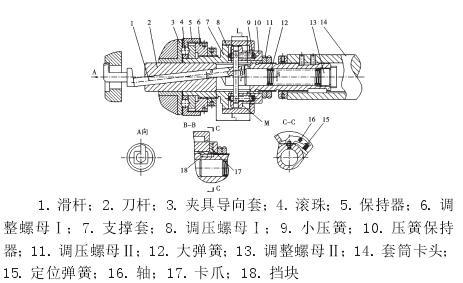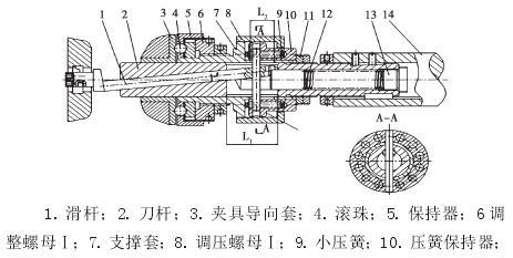 从图 5 可看出,其装置的结构设计可在切削端面的基础上完成让刀运动,即实现反锪并让刀。当图 5 所示的设备装置经过刀具的径向移动实现端面的切割时,对螺母上的小弹簧进行试压上,在机床主轴的轴向移动过程的基础上,小压簧所受的压缩力增大,能够使得刀具进行又一轮的轴向运动,从而能够保证让刀运动的全部完成,在这一过程中卡爪经过在定位弹簧的定格作用,会沿着轴绕向回转,卡爪卡入到卡槽中,使弹簧的作用失效;整个让刀任务完成后,主轴会沿轴倒退,这时整个设备的端面切刀会做径向退回运动,安装在刀杆上的挡块把卡爪顶起,小压簧此时发生作用下,切刀错开让刀的距离的移动,然后全部刀杆随主轴一起退回到最初的位置,以等待新一轮的运动。