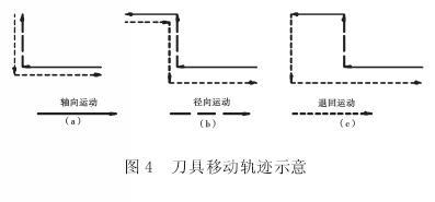 但在实际的工作过程中,往往会出现刀具划伤已加工表面的情况,为避免这种情况,就需要设置另一个步骤,让刀运动,该步骤添加后,图 2、图 3 中所示的 2 个装置就不再合适于加工孔的内槽和孔的端面。在刀具不退回的情况下,刀具的运动轨迹如图 4(c)所示,在刀具纵向到达切削端面的位置后,运动轨迹会发生变化,开始转走径向的运动方式,在端面的切削完成后,会调整一个轴向运动,这就是所要达到的让刀运动,当整个让刀过程结束后,刀具开始改为径向移动退回,以达到实现轴向移动退回的最终目标。