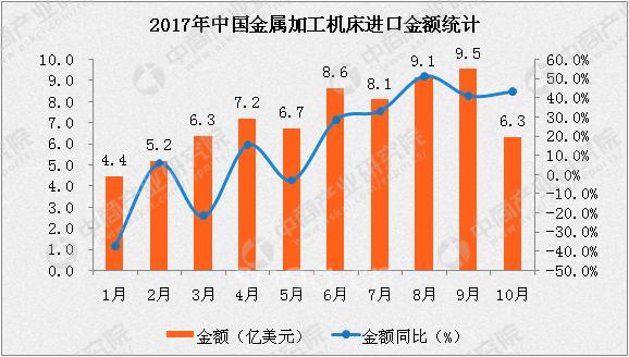 2017年10月中国金属加工机床进口金额6.3亿美元,同比增长43.1%。1-10月,中国金属加工机床进口金额达71.4亿美元,同比增长13.1个百分点。