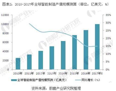 根据工信部的统计,2010年以来我国制造业产值规模占全球的比重在19%-21%之间。2016年,我国智能制造行业产值规模达12233亿元。据此测算,2016年,全球智能制造产值规模在8687亿美元左右。2017年,全球智能制造持续高速增长的态势,预计2017年全年产值规模将达到1万亿美元左右。