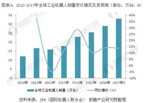工业机器人 是智能制造业最具代表性的装备。根据IFR(国际机器人联合会)发布的最新报告,2016年全球工业机器人销量继续保持高速增长。2016年全球工业机器人销量约29.0万台,同比增长14%。其中,中国工业机器人销量9万台,同比增长31%。IFR预测,未来十年,全球工业机器人销量年平均增长率将保持在12%左右。预计2017全年,全球工业机器人销量在33万台左右。