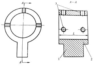 (2) 粗加工内孔。将 φ30mm 的标准钻头安装在车床尾座上,预钻 φ30mm × 120mm 左右深的导向孔。将深孔加长钻头的刀杆装夹在专用夹套内,如图 4 所示,使钻头可在夹套内自由滑动,并伸出 300mm 左右长度,锁紧夹套上的螺栓,将刀杆安装在方刀架上。来回移动床鞍,让加长钻头在预孔内反复移动数次,调整钻杆轴心线位置确保与工件轴心线同轴。为减少加工硬化现象发生,选取 Vc = 12m/min、f= 0. 25mm / r 左右的切削用量进行钻孔。切削液通过管接头直接流入钻头的容屑槽内出液口处,直接冷却钻头。每次进给的深度达到 15mm 左右时,迅速退出钻头排屑并清除碎屑,进行润滑。钻孔时一定要记住大拖板刻度盘起点和终点的读数,下次钻孔要在上次钻孔深度前约 1mm 处开始进给,不要等钻头接触工件后再进给,避免钻尖在工件表面停留,加剧切削表面硬化,造成钻削困难,加快钻头磨损。加工中应经常保持钻头锋利,必要时增加修磨钻头次数。