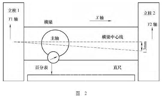 (2)应用实例。某数控镗铣床,JOG方式下X轴可以运动,但是横梁(即Y轴)移动就出现报警,报警内容为龙门超差。分析原因是横梁扭曲超出极限值,即横梁中心线不水平了,龙门轴扭了,也就是龙门横梁Y轴的主动轴Y1和同步轴Y2不同步了,两者之间距离太大而超出允差带。维修时需要重新调整Y1和Y2的相对位置使两者平衡,首先用百分表测量横梁扭曲程度,百分表固定在主轴上,表针压在直尺上,在X轴负向端点将百分表置零,JOG方式下移动X轴向正向运动,测出X轴正向端点百分表读数值1.3mm,说明Y1轴和Y2轴相差1.3mm,即横梁中心线偏差1.3mm,如图2所示。
