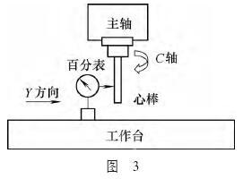 (2)应用实例。某五坐标数控机床在进行三坐标加工时正常,在五坐标加工时零件尺寸超差。需要对C轴的回转精度进行检查:A、C轴回零,然后加上五坐标指令,将百分表打在Y方向心棒的母线上,旋转C轴一周,百分表检测的最大偏移值为±0.10mm,如图3所示。说明C轴的回转中心和主轴的回转中心不重合,C坐标的精度超差从而造成了零件外型尺寸超差。在参数MD24550中进行补偿(Y轴方向),补偿值为0.05mm。补偿后进行检验的结果表明,精度满足实际加工要求。