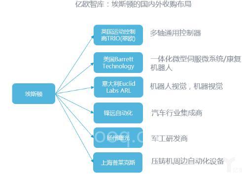 通过国内外相关机器人领域的收购分析,亿欧智库发现,经过过去两年的收购,一些有实力的国内机器人企业,或制造企业,已经初步完成了从上游核心零部件到下游行业集成的布局(例如上图埃斯顿自动化),但还有很多机器人相关企业只是收购了其中部分环节,还没完成全产业链布局。