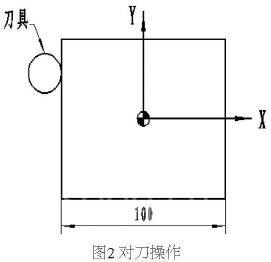 和Y轴对刀需要完成以下步骤:一是将工件通过夹具装在工作台上,装夹时,工件的四个侧面都应留出对刀的位置。二是使刀具以一定的转速旋转,借助手动或手摇方式移动工作台,使刀具靠近毛坯左面,移动主轴使刀具在Z方向下适量的深度,通过观察铁屑或听切削声音的方法判定刀具是否接触到毛坯左面,如图2所示。