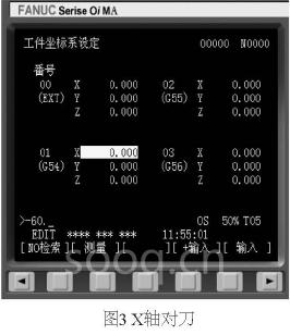 (3)调出G54坐标系,把光标定位到X,输入“1/2数值”并保留原正号或负号(如果是正号,符号可以省略),然后点击测量下方的软键完成X轴方向的对刀。