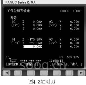 刀具旋转,控制工作台和主轴快速移动,让刀具移动到靠近工件上表面有一定安全距离的位置后,降低移动速度使刀具底面和工件上表面接触,此时,调出G54坐标系,如图4所示,把光标定位到Z输入0,点击测量下方对应的软键即可实现对Z轴的对刀。