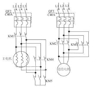 机床原有电气原理图的主电路只包括主运动控制和进给运动控制,如图 4 所示。主电机由空气开关 QF 保护,通过接触器 KM 实现星形/三角形降压启动。进给电机由空气开关 QF 保护,通过接触器 KM 实现正反转控制。