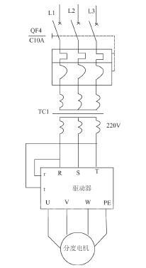 改造后的电气原理图增加了分度运动控制部分,分度运动控制主要包括空气开关 QF、变压器 TC、驱动器和分度电机等电气元件,其电气原理如图 5 所示。
