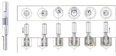 我们在加工中心常见的加工螺纹的方式就是铣削螺纹,这样的加工方式加工出来的零件质量比较稳定,尺寸也能有严格的需要。我们都知道,铣削螺纹是通过螺纹插补来运行的,换言之,铣削螺纹的过程其实就是使用螺纹铣刀沿螺旋插补轨迹进行铣削加工的过程,而螺纹铣削的加工轨迹可分为三种:导入段、螺纹加工循环和导出段。我们在螺纹的加工时,刀具的切入是需要有导入的而不是直接的切入,一般来说,我们会采用直线切入或者1/4圆弧切入,需要注意的是在切入时一定要找准固定点再进行导入。我们完成了导入这一工序时,可以发现刀具就到了加工螺纹的起点,我们也是在这里对工件进行完整的螺纹插补加工然后进行螺纹的铣削的。在完成了一个螺距的加工后再重复之前的加工,直到按照加工需求完成对应的螺纹长度,在这个过程一定要注意的是编程长度必须是螺纹的整数倍。我们在完成了铣削螺纹的长度后,就要使得刀具迅速离开螺纹,以免出现了乱扣的现象。我们在导出和导入时,所有的性质都是一样的,只不过方向相反。图2表达了铣螺纹的过程: