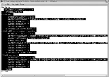 基于IMSpost(后 处 理 程 序 编 辑 器)开 发 具 有3D 刀具补偿功能的后置处理器,需根据非正交摆头转台 类 五 轴 数 控 机 床 结 构 和 配 置 的 SIEMENS840D 数控系统程序格式进行设置、修改、子程序调用及宏程序编制等。宏程序编制实现后置处理的主要任务除刀位文件信息的读取、机床运动学变换求解、进给速度的校验、非线性运动误差校验外,还应完成切触点处表面法向矢量的求解。SIEMENS 840D 数控系统自定义了五轴数 控加工时实现3D 刀具的补偿指令,即刀具长度补偿指 令 为 TRAORI 和 半 径 补 偿 功 能 的 命 令 为CUT3DF。为实现3D 刀具补偿功能,在调用3D 刀具补偿指令后,除需知道机床坐标系下刀具中心点坐标和2个旋转轴的旋转角度外,还需提供切触点处表面的法向矢量。当刀具尺寸发生变化,把变化量添加到数控系统刀具补偿量里,SIEMENS 840D数控系统就可根据具有3D 刀具补偿格式的 NC 代码自动进 行 补 偿,从 而 提 高 了 数 控 加 工 程 序 的 重用性。以球头铣刀为例,利用IMSpost平台的宏命令功能,基于后置处理算法,主要通过在 GOTO/* 宏命令中编译宏程序实现刀具中心点坐标和旋转角度的输出;基于五轴数控加工 3D 刀具补偿矢量的矢量算法,可在 NORMAL/* 宏命令编译宏程序中实现切触点处表面法向矢量输出。NORMAL/* 宏命令中具体的代码如图3所示。