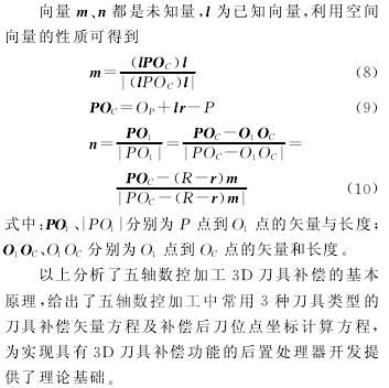 由于刀轴矢量不变,二维刀具半径补偿的实质只是将切触点的坐标按其表面 的法向矢量 进行偏置,再对刀具中心点编程;而在 3D 刀具补偿中,由于刀轴矢量不断变化,刀位点的补偿矢量与二维刀具半径补偿不同,是通过切触点表面的法向矢量、刀具方向和刀具几何尺寸计算得出。下文分别对五轴数控加工中常用的端铣刀、球头铣刀和环形铣刀进行矢量分析,计算得出3D 刀具补偿的补偿矢量及补偿后的刀位点坐标,见下页图1。图 中:P 为 切 触 点,OP(x,y,z)为 刀 具 中 心点,即 刀 位 点,OC为 刀 心 点,O1为 刃 口 圆 心,P(px,py,pz)为切触点,R 为刀具半径,r、r1均为刃口半径,n(nx,ny,nz)为 切 触 点 表 面 的 法 向 矢 量,l(lx,ly,lz)为刀轴矢量,m(mx,my,mz)为垂直于刀轴方向的矢量,v(vx,vy,vz)为补偿矢量,以上矢量均为单位矢量,k为路径切线。