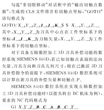 (2)基于 UG 的前置处理,建立了控制刀位文件格式的函数,实现了在五轴数控加工模块下可输出包含切触点在内的刀位文件,解决了五轴数控加工3D 刀具补偿后置处理所需的刀位信息问题,为具有3D 刀具补偿功能的后置处理器的开发奠定了技术基础。
