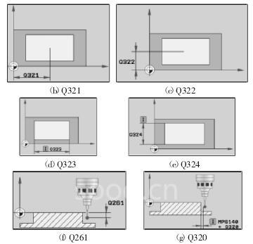 - - TCH P ROBE411如图 3(a)所示,探测循环 411(TCH PROBE411)能实现加工原点的偏置,同时也能对加工原点的位置进行精确修正,也可以用于确定矩形凸台的中心并将其定义为原点。如果需要的话,TNC 也可以将坐标输入到原点表或预定表中。TNC 将按照 MP6150 或MP6361 的设置值快速移动定位,将测头定位在编程起点位置 1处。TNC 将执行循环中数据和 MP6140 的安全高度数据计算探测起点;然后测头运动到所输入的测量高度处并以探测进给速率(MP6120 或 MP6360)探测第一触点;然后将测头沿近轴运在测量高度处或下一起点 2 的间隔高度处并探测第二触点;然后 TNC将测头定位在起点 3 位置处,再定位在起点 4 位置处,探测第三和第四触点;最后 TNC 再将测头移回间隔高度处并处理根据循环参数 Q303 和 Q305 所确定的原点。TCHPROBE411 循环各参数的图解,如图 3 所示。
