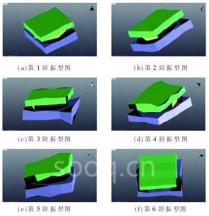 对设置好的有限元模型进行模态计算, 并取其前6 阶的固有频率,如表 2 所示,振型如图 2 所示。
