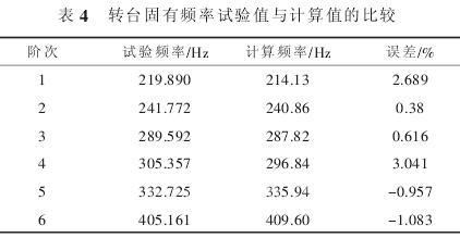 对转台的试验与计算得到的固有频率进行对比,如表 4 所示。