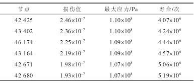 从表 6 中可以看出单元节点的寿命、损伤、应力情况等参数,可以容易地看出危险节点的位置,从而对材料的选择、 尺寸的设计和外形的改进等都有一定的指导意义。