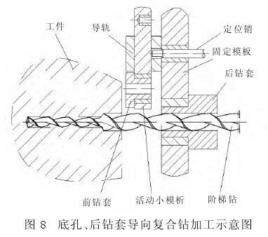(1)钻一基础引孔。如图 7 所示,前钻套安装在活动小模板上,通过油缸带动活动小模板沿着导轨向下运动,当活动小模板移动到位,安装在固定模板上的定位销插入活动小模板的销孔,保证前钻套与安装在固定模板上的后钻套同轴,然后主轴箱带动阶梯钻前段、后段分别进入前钻套及后钻套内定位,加工 准8 深孔的一小段深 20 作为基础引孔。