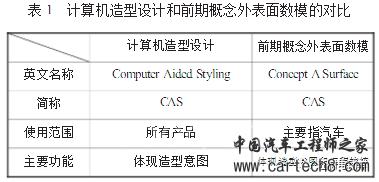 计算机造型设计的英文名称为ComputerAidedStyling,简称为CAS;前期概念外表面数模的英文名称为ConceptASurface,也简称为CAS。二者的使用范围和主要功能不同,二者的对比见表1。