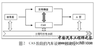 在项目进行中,几乎所有的项目都有时间和资源相对匮乏的问题,而且一般包含多次评审和修改。要完成项目目标,不仅对CAS设计师的能力有较高的要求,而且需要项目组所有成员对整个流程有较深入的理解,与此同时还需充分理解CAS和各相关专业的关系,所以,理清CAS和各相关专业的关系十分重要。在图2中,我们看到CAS和效果图、实物模型、工程可行性分析、A面之间存在复杂的关系,如何理清这些关系是比较重要的,一般需要理清以下几个关系:CAS和效果图的关系,CAS和实物模型(一般为油泥模型)的关系,CAS和A面的关系,CAS和工程可行性分析的关系