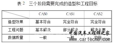 三轮CAS是不断完善的过程,每个阶段的要求都是不断提高的,最终需要满足造型和工程的要求,三个阶段需要完成的造型和工程目标见下表2。造型和工程在许多时候是有冲突的,这就需要造型师、工程师和CAS设计师的智慧去创造性地解决问题,在这个时候经验和创新思维就显得尤为重要,要么更改造型,要么更改结构,或者两者都改,具体怎么改,要看双方博弈的结果了。在项目中CAS设计师是具体制作者,通常比较了解情况,其在造型和工程有冲突的时候提的建议一般是最有效的,因此CAS设计师的能力就显得非常重要。