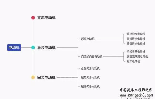 大体上电机可以按照按工作电源、结构及工作原理、起动与运行方式的不同以及用途的不同来分类。其中适合于新能源汽车的驱动的电机主要有永磁同步电机、感应电机和开关磁阻电机三大类。在此,我们先用一张图来概括一下按结构及工作原理方法归类的电机。