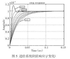 执行 MATLAB 的相关程序后,得到的阶跃响应曲线,如图 5所示。当 f=0.11,系统的超调量的值偏大,这也说明从系统受到阶跃响应开始到最终的稳定值,其波动变化范围比较大,系统不太稳定。当 0.1