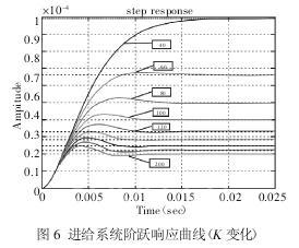 执行 MATLAB 的相关程序后,可以得到的进给系统随着系统总的刚度变化而产生的阶跃响应曲线,如图 6 所示。当 f=0.21,J0=0.0031kg/m2时,随着进给系统总体等效刚度 K 的增大,系统达到稳态后输出幅值越来越小。这与实际的情况相符,随着刚度的增加,系统的振动会越来越小。因此,我们需要选取一个合理的值,既能够保证系统的刚度,又能够满足加工精度的要求。