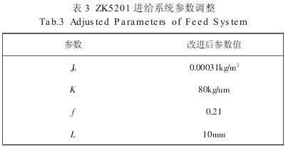 对于 ZK5201 数控钻床而言,通过以上的分析可得,系统的阶跃响应达到稳态的幅值为 0.1mm,根据孔的加工要求,综合考虑误差的影响因素其振动误差应控制在 0.05mm 左右,因此应当减小机床进给系统达到稳态后的幅值。综合以上的分析得到,影响进给系统精度最主要的参数有四个:总的转动惯量、总的等效刚度、等效阻尼系数和丝杆的导程。