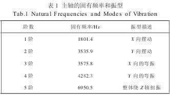 主轴在理论上是可以求出无穷多阶的频率,但是对于实际的加工过程而言,只有最低的几阶固有频率才有可能和实际外界的激励频率相接近。ANYSYS Workbench 的模态分析结果,如表 1所示。