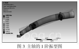 在对主轴进行模态分析中,主要考虑工作频率附近的固有频率的分布情况,应该尽量地避免工作频率附近存在共振频率,通常设定主轴的最高的工作转速不能超过 1 阶的临界转速的75%。其 1 阶模态振型,如图 3 所示。