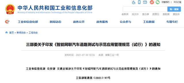 近日,工业和信息化部、公安部、交通运输部联合发布《智能网联汽车道路测试与示范应用管理规范(试行)》(工信部联通装〔2021〕97号,下称《规范》)。工信部有关负责人表示,道路测试等系列工作开展,促进我国智能网联汽车产业发展取得积极成效,基本与全球先进水平处于“并跑”阶段。