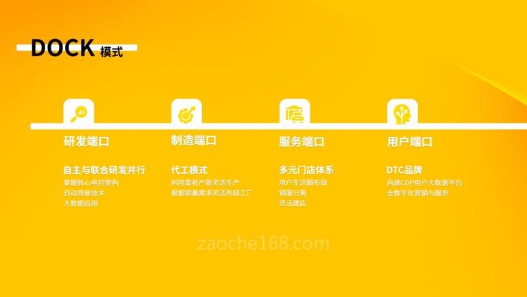 DOCK商业模式,针对汽车重资产与高成本的行业痛点,以更轻量化、更灵活、更快速的方式发展。重庆新特汽车将成为专注核心技术研发、直面用户运维、快速应对市场的大脑,直连当下成熟的新能源产业链,高效灵活地利用各类技术、生产及服务资源,为用户带来高性价比的产品与服务。