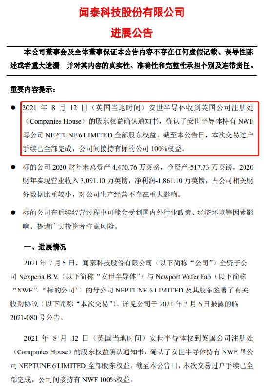 8月16日,闻泰科技发布“进展公告”称,旗下子公司安世半导体(Nexperia B.V.)已经收到英国公司注册处 (Companies House)的股东权益确认通知书,确认了安世半导体持有 NWF(Newport Wafer Fab,标的公司) 母公司 NEPTUNE 6 LIMITED 的全部股东权益。