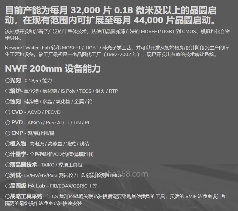 而根据NWF官网显示,其产能大约为每月3.2万片,最多可扩展至每月4.4万片,芯片制程主要以0.18μm(及其以上)为主,相关技术主要应用于MOSFET、IGBT、CMOS、Analog和化合物半导体等领域。
