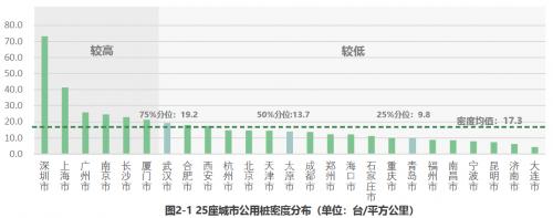主要城市公用桩的平均密度整体超过17台/平方公里,但城市差异很大。深圳市的公用桩密度最高,达到73.2台/平方公里。而大连市的公用桩密度最低,仅有4.2台/平方公里。在北上广深四座一线城市中,公用桩密度水平依次为深圳>上海>广州>北京。
