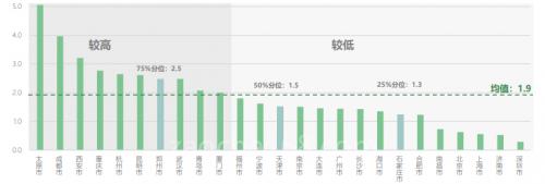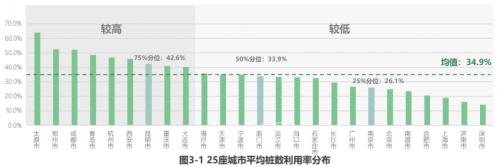 平均桩数利用率超过40%的城市仅有9座。其中,最大的太原市达到64.0%,最小的深圳市仅为14.2%。从桩数利用率的频数分布看,各城市平均桩数利用率小于20%的公用桩点位占比平均值超过60%。多数城市公用桩的日平均周转率偏低,桩均服务车辆数不足2辆