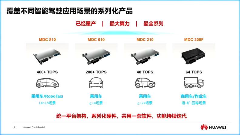 据了解,华为可以提供系列化的面向不同场景的产品,其称之为“统一平台架构,系列化硬件,共用一套软件,功能持续迭代”,这种平台支持上层应用平滑升级。具体产品型号有:MDC 810,有400+TOPS的算力,可以满足L2+、L3、L4、L5应用场景;MDC 610,提供200+TOPS的算力,针对L4场景,主要面向于乘用车;MDC 210,有48TOPS的算力,针对L2+场景;MDC 300F,面向商用车场景,比如矿卡、高速物流以及园区。