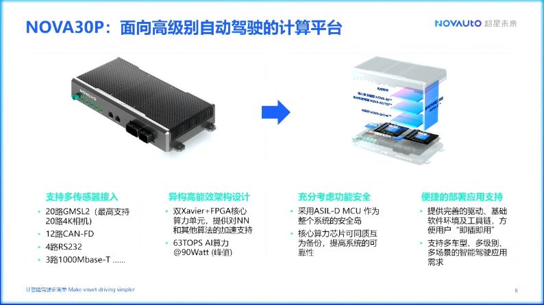 据梁爽介绍,超星未来今年5月发布的高级别自动驾驶计算平台,能够支持多路传感器接入和处理,最高支持20路4K相机、3路千兆网口接入和12路CAN-FD。在中间计算配置方案上是采用英伟达Xaiver SOC满足算力需求,同时引入异构方案FPGA和MCU,在满足用户算力需求的同时应对除开神经网络之外其他的计算需求。同时在功能安全上也做了大量的工作。“我们还会提供完善的驱动、基础软件环境及工具链,真正让用户做到即插即用,我们现在跟很多客户实现了多种车型、多种级别、多个场景下自动驾驶计算平台的应用。”