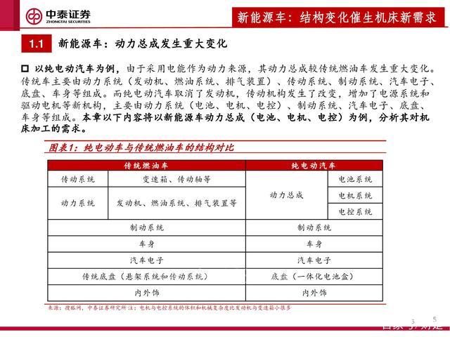 以纯电动汽车为例,由于采用电能作为动力来源,其动力总成较传统燃油车发生重大变化。 传统车主要由动力系统(发动机、燃油系统、排气装置)、传动系统、制动系统、汽车电子、 底盘、车身等组成。而纯电动汽车取消了发动机,传动机构发生了改变,增加了电源系统和 驱动电机等新机构,主要由动力系统(电池、电机、电控)、制动系统、汽车电子、底盘、 车身等组成。本章以下内容将以新能源车动力总成(电池、电机、电控)为例,分析其对机 床加工的需求。