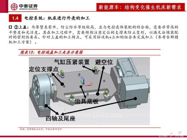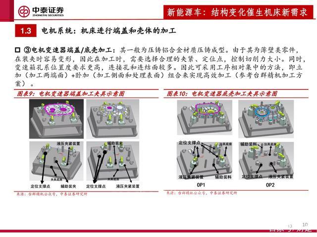 ③电机变速器端盖/底壳加工:其一般为压铸铝合金材质压铸成型。由于其为薄壁类零件, 在装夹时容易变形,因此在加工时,需要选择合理的夹紧、定位点,控制切削力大小。同时, 变速箱孔系位置度要求更高,连接孔和连结面较多。因此可采用工序相对集中的方法,即立 加(加工两端面)+卧加(加工侧面和处理表面)组合来实现高效加工(参考台群精机加工方 案) 。