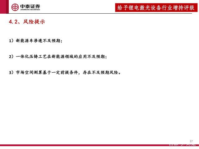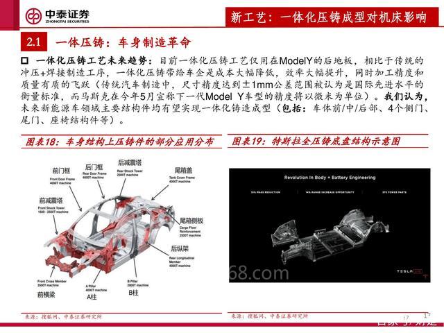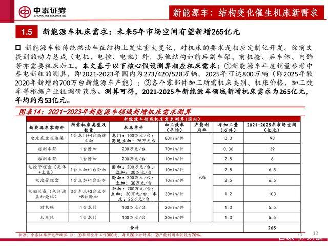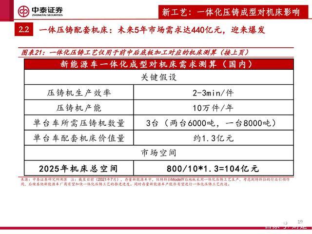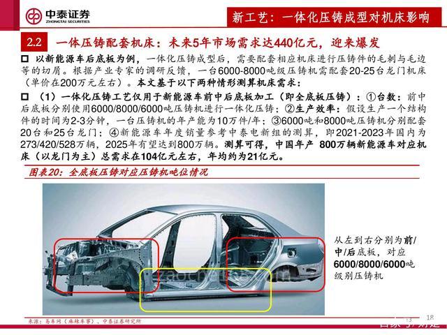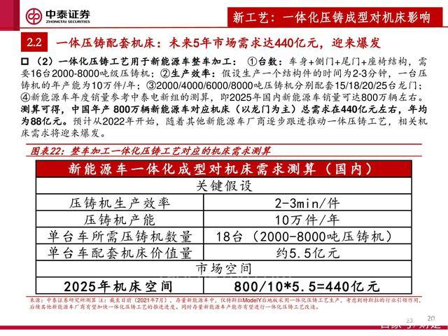 (2)一体化压铸工艺用于新能源车整车加工: ①台数:车身+侧门+尾门+座椅结构,需 要16台2000-8000吨级压铸机;②生产效率:假设生产一个结构件的时间为2-3分钟,一台压 铸机的年产能为10万件/年;③2000/4000/6000/8000吨压铸机分别配套15/18/20/25台龙门; ④新能源车年度销量参考中泰电新组的测算,即2025年国内新能源车销量可达800万辆左右。 测算可得,中国年产 800万辆新能源车对应机床(以龙门为主)总需求在440亿元左右,年均 为88亿元。预计从2022年开始,随着其他新能源车厂商逐步跟进推动一体压铸工艺,相关机 床需求将迎来爆发。