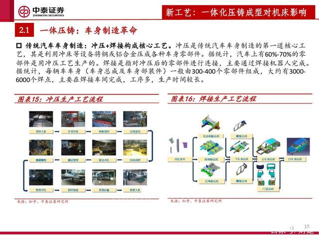 一体化压铸颠覆传统汽车制造工艺。一体化压铸成型工艺可大大减少零部件使用数量,一 次压铸即可获得完整的零部件,从而取代传统复杂的冲压+焊接工序,大幅缩短制造时间。以 目前已经应用该技术的ModelY后地板制造为例,其使用6000T压铸机一体成型,零件数从70 多个减少为1-2个,焊点大约由700-800个减少到50个,同时制造时间由原来的1-2小时缩减至 3-5分钟,效率大幅提升。