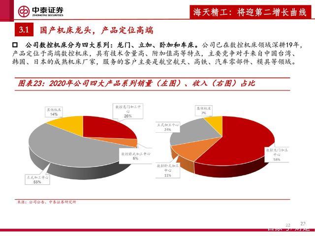 公司数控机床分为四大系列:龙门、立加、卧加和车床。公司已在数控机床领域深耕19年, 产品定位于高端数控机床,具有技术含量高、附加值高等特点,主要竞争对手来自中国台湾、 韩国、日本的成熟机床厂家,服务的客户主要是航空航天、高铁、汽车零部件、模具等领域。