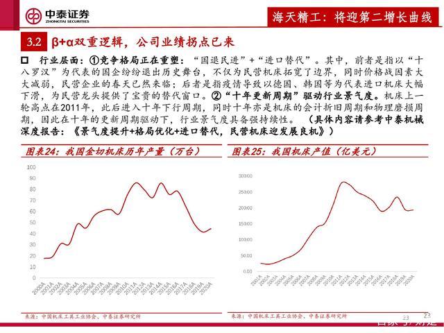 行业层面:①竞争格局正在重塑:“国退民进”+“进口替代”。其中,前者是指以“十 八罗汉”为代表的国企纷纷退出历史舞台,不仅为民营机床拓宽了边界,同时价格战因素大 大减弱,民营企业的春天已然来临;后者是指疫情导致以德国、韩国等为代表进口机床大幅 下滑,为民营龙头提供了宝贵的替代窗口。②“十年更新周期”驱动行业景气度。机床上一 轮高点在2011年,此后进入十年下行周期,同时十年亦是机床的会计折旧周期和物理磨损周 期,因此在十年的更新周期驱动下,行业景气度具备强持续性。