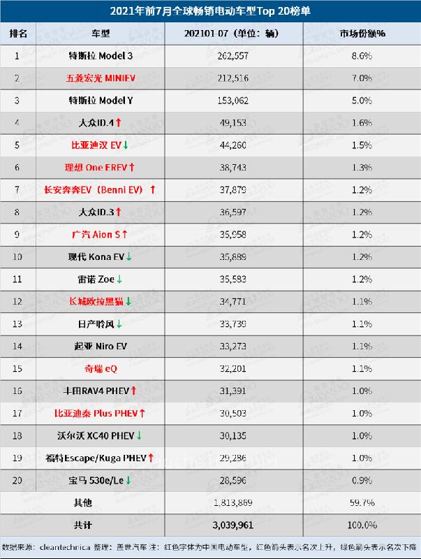 7月全球最畅销Top 20电动车榜单:中国车型进步明显,占据11个席位