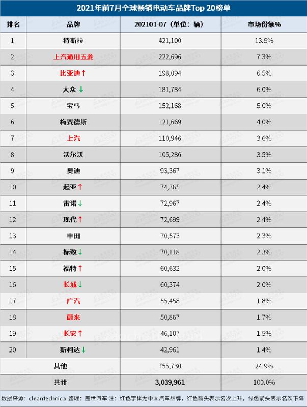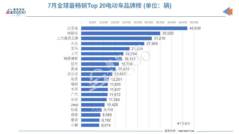 7月全球最畅销Top 20电动车品牌榜:比亚迪打败特斯拉和上汽通用五菱